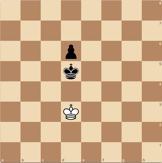 Не все позиции король+пешка против одинокого короля выигрышны. Из прошлых уроков мы узнали, что для победы сильнейшей стороне надо захватить королём ключевые поля пешки. Если у них нет возможности, то позиция ничейная. Однако, для того, чтобы не проиграть ничейную позицию слабейшая сторона должна правильно действовать. Рассмотрим следующую позицию. Результат этой позиции зависит от очереди хода. При ходе белых - проигрыш, белый король вынужден отойти и черный король прорывается на ключевое поле. Напомню, что здесь ключевые поля это c4, d4, e4. При ходе черных - ничья. Сейчас белые не пропускают короля к ключевым полям. Когда черный король отходит, мы идём в оппозицию и снова не пропускаем его к ключевым полям. Белые заставляют черных походить пешкой, а значит ключевые поля тоже переместятся. Например 1. ... Кре5 2. Кре3 Теперь, если черные пойдут королём на d5 или е6, мы пойдём в оппозицию. Если они отойдут королём от пешки, то мы пойдём нападать на пешку. В итоге мы всё равно застави
