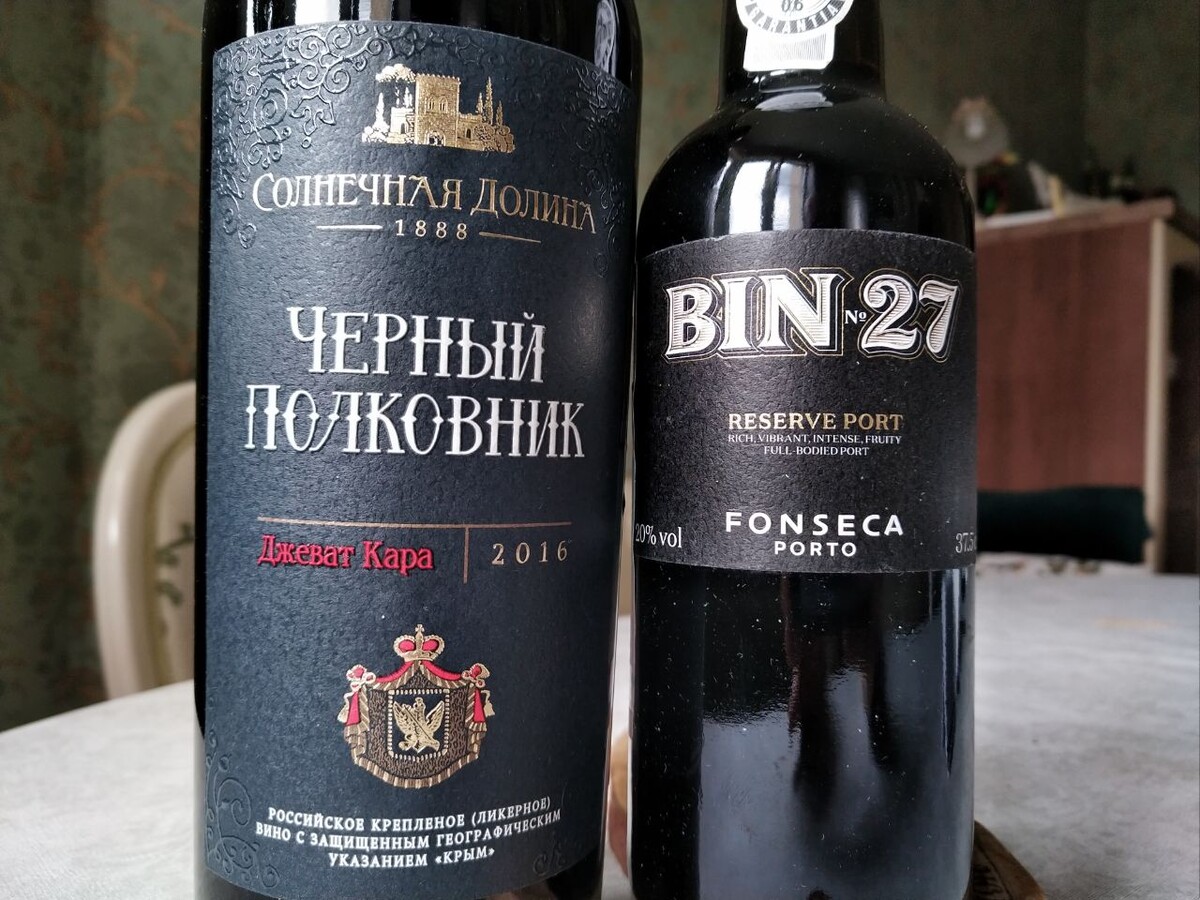 Давно не было в блоге всеобщего любимца "Чёрного полковника" (далее ЧП) от винодельни "Солнечная долина". Тем желанней новая встреча - сравнение с португальским портвейном. В этот раз выбор пал на Fonseca Premium Reserve Bin 27, потому что он сопоставим с ЧП по уровню сахара. Давайте сразу об этом португальце, который первый раз в блоге. Не о производителе и традициях, этого полно в сети, а о том, что в бутылке объёмом 0,375л. Там портвейн из нескольких сортов без указания года урожая, так как портвейны могут быть сделаны из винограда нескольких лет урожая. Даже, если на русской контрэтикетке указан год, это не значит, что он такой и есть. Дальше, надпись Reserve говорит о том, что выдержка портвейна больше, чем у простого ruby, которую заслужили более качественные спирты. Содержания сахара 104 г/л, алкоголя 20%, дата розлива - март-2019. ЧП имеет традиционные для него алкоголь и сахар - 17,5% и 110 г/л, соответственно. Он изготовлен из автохтонных и европейских сортов винограда. Он о
