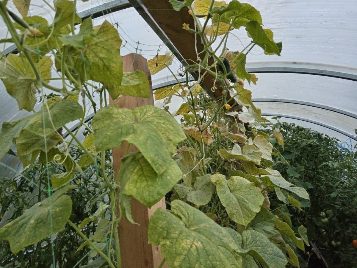 Добрый день, друзья. Сегодня хочу поговорить об опасном вредителе – паутинном клеще. Эти маленькие насекомые могут лишить урожая огурцов. В прошлом году в теплице на огурцах появился этот опасный вредитель, но я нашла способ сохранить и продлить плодоношение огурцов. Паутинный клещ размером 1-2 мм, поэтому такого вредителя довольно сложно увидеть на огурцах. Мы его не видим, но он уже появился и питается соком листьев. Поэтому проще всего распознать наличие вредителя на нижней стороне листа. Там появляется паутина. А сверху на листе появляются пятна, эти мелкие места проколов сначала желтеют, а затем становятся серыми. Затем лист засыхает. И тем временем паутинный клещ захватывает понемногу весь куст, нанося огромный ущерб урожаю. Паутинный клещ быстро размножается, особенно во влажной и теплой среде. Паутинный клещ является мелким насекомым. Поэтому достаточно создать пленку на листьях, чтобы он не смогу питаться соком растений. Для этого проводим профилактическую обработку огурцов