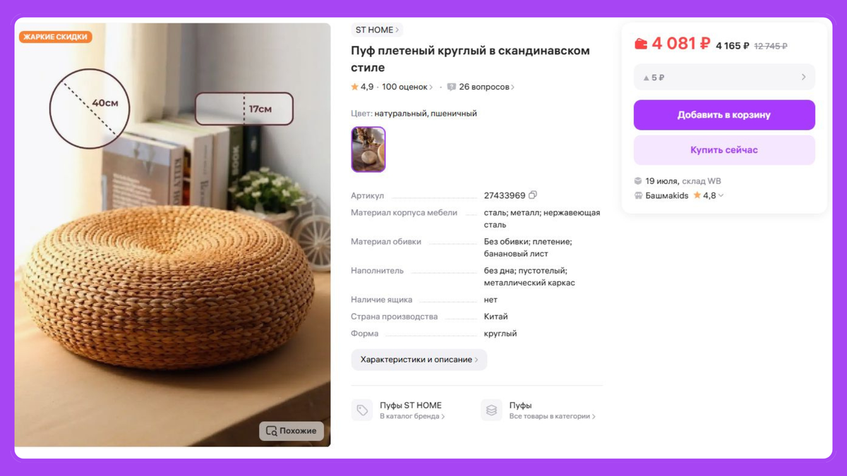 Знаете, я тут недавно заказывала на WILDBERRIES💜 очередную мелочь для дома и поняла — у меня уже целая коллекция товаров, которые реально изменили мою жизнь! Серьезно, есть такие вещи, на которые смотришь и думаешь: "Как же я раньше без этого жила?!" Решила собрать для вас свои самые любимые находки — те самые помощники, которые делают дом уютнее, а быт проще. Уверена, среди них найдется что-то и для вас! Поехали смотреть, что у меня в копилке? 😊 Предупреждение: данный материал носит исключительно информационный характер и не является рекламой. Я делюсь своими наблюдениями и впечатлениями, не пытаясь навязать вам покупку каких-либо товаров. Все суждения и оценки являются субъективными. Девочки, я влюбилась в этот пуфик! 💕 Знаете, как бывает — покупаешь что-то для красоты, а потом понимаешь, что это просто обязательный продукт? Вот этот плетеный пуф от ST HOME именно такой случай! Самое главное, он реально прочный — до 120 кг выдерживает (проверено мужем 😄). Использую везде — то ног