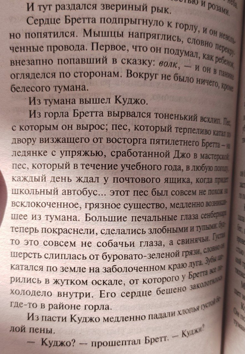 Тут раздалось рычание. 💔 Сердце у него подпрыгнуло в груди, и он чуть отступил назад. Первой его панической мыслью, как у ребенка в сказке, было «волк», и он дико огляделся по сторонам. Кругом был один туман. Из тумана вышел Куджо. Бретт издал горлом свистящий звук. Пес, с которым он вырос, который безропотно возил пятилетнего Бретта на спине по двору, который терпеливо ждал каждый день школьного автобуса, стоя у почтового ящика.., этот пес лишь отдаленно напоминал призрак, возникший сейчас из тумана. Большие, печальные глаза сенбернара теперь были воспаленными и бессмысленными, скорее свиными, чем собачьими. Шерсть его перепачкалась в зеленоватой грязи, будто он бродил по болотам. На морде кривилась ужасная ухмылка, ужаснувшая Бретта. Мальчик почувствовал, как сердце прыгает у него в груди. Из пасти Куджо стекала длинная лента слюны. — Куджо? — прошептал Бретт. — Куджо? *** Куджо смотрел на Мальчика, не узнавая его — ни его лица, ни его одежды, ни запаха. То, что он видел, было