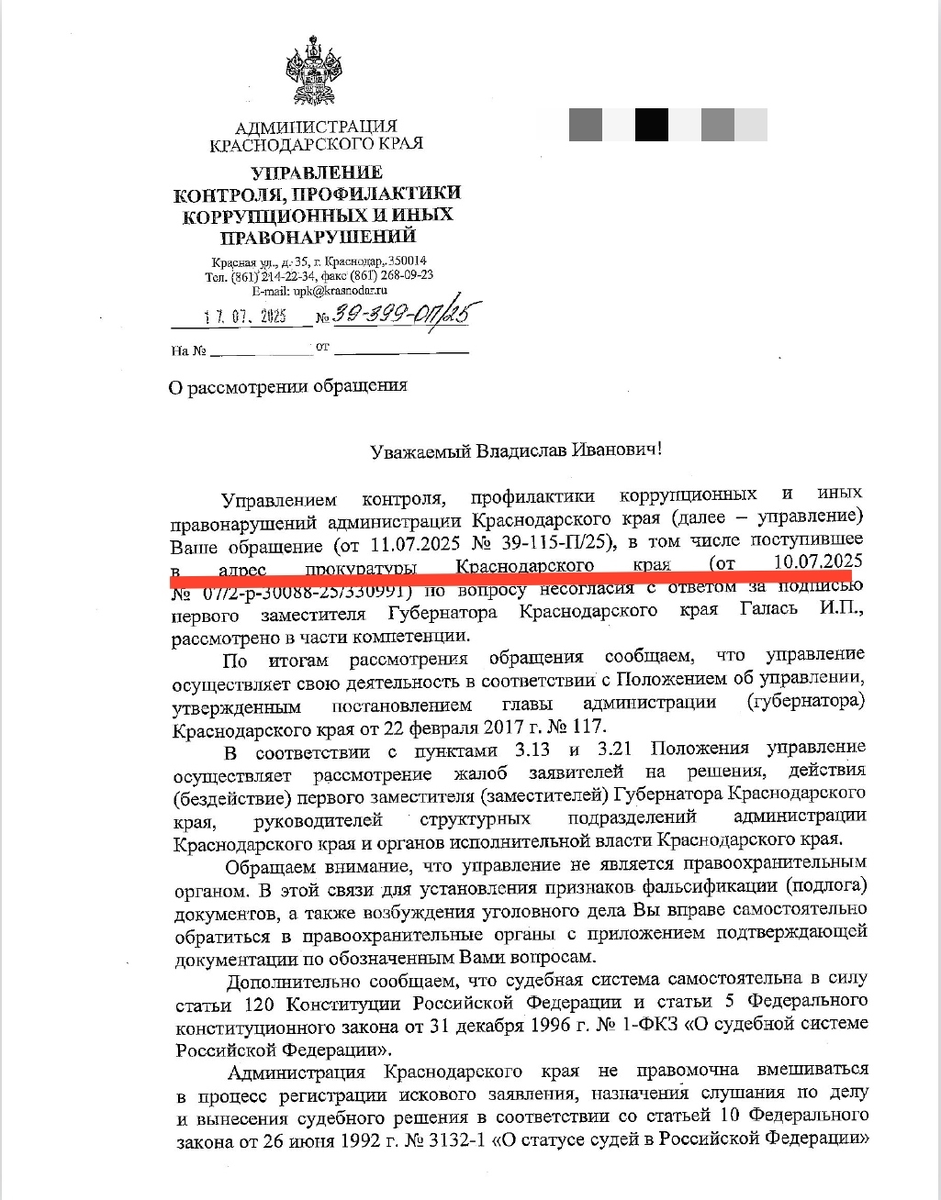 Начальник отдела по надзору за соблюдением прав и свобод граждан прокуратуры Краснодарского края Бабич В.В. (исх. №07/2-Р-30088-25/330991) в пятый раз незаконно перенаправила мою жалобу в администрацию края, хотя: