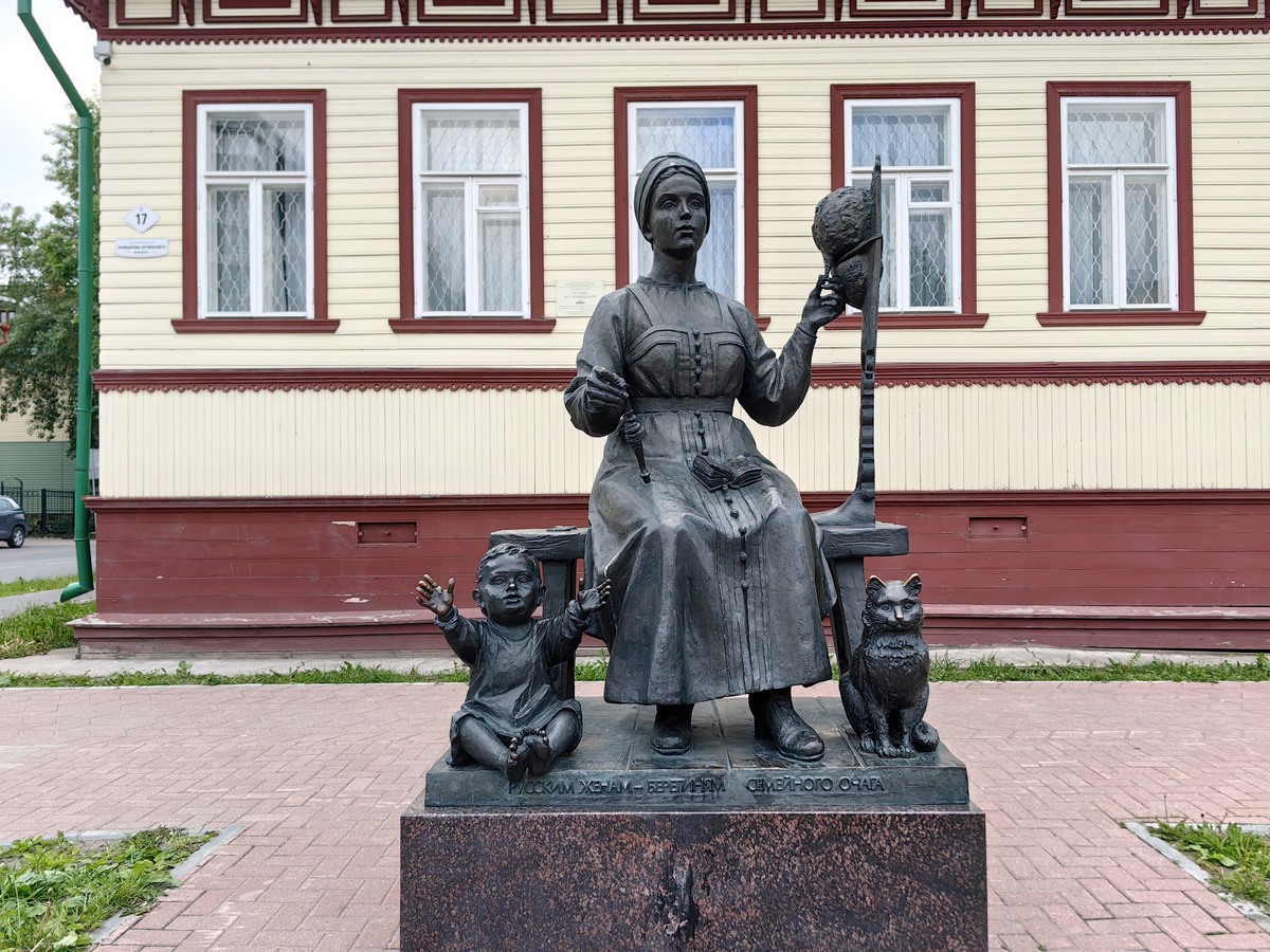 Люблю я такие добрые трогательные памятники. Думаю, этот вам тоже понравится. Это памятник «Русским жёнам - берегиням семейного очага» в любимом моём Архангельске. Находится он на проспекте Чумбарова-Лучинского, возле дома №17. Этот трогательный памятник был открыт 28 сентября 2009 года. Его автором является известный архангельский скульптор Сергей Сюхин. Именно он воплотил в бронзе этот проникновенный образ. В чём его смысл? А во многом! И эта работа в очередной раз заставляет задуматься о предназначении женщины. Памятник посвящён русской женщине — опоре семьи, хранительнице домашнего уюта, любви и верности. Он носит название «Русским жёнам — берегиням семейного очага», и это название говорит само за себя. Берегиня. Образ хранительницы дома, оберегающей его от злых сил. Женщина — хранительница семейного благополучия. Скульптура изображает молодую женщину в традиционном северном наряде за работой, в руках прялка, а рядом ребёнок. Её лицо выражает не печаль, а огромную силу духа, с