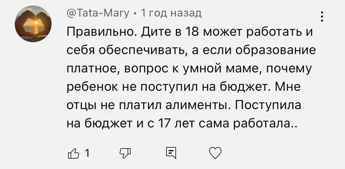 Я тоже за то, чтобы ребёнок начинал работать как можно раньше — но из интереса, из желания проявить себя, научиться зарабатывать, дать что-то миру. Но когда ребёнок вынужден работать ‘потому что больше никто не содержит’ — это уже не про развитие, это про выживание. И страшно, что в 2025 году это пишет не кто-то, а женщина. Как будто если с нами в прошлом поступили несправедливо — значит, и другим терпеть нормально? Я за то, чтобы подросток мог зарабатывать, если хочет. Но изобилие — это когда он делает это не ‘кем угодно и хоть бы как’, а выбирает осознанно, чему учиться, куда вкладывать своё время. А уж если вспомнить, что у нас большинство вузов — платные, то эта логика вообще не выдерживает критики: как ребёнок в 17 лет должен одновременно работать на себя, помогать маме, платить за обучение и ‘ставить всё на поток’? Это под силу единицам, но не может быть нормой для всех. Согласны со мной?