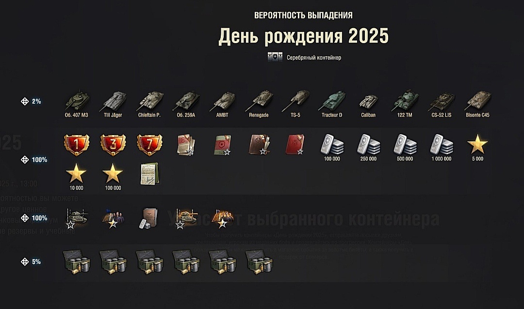 Уже буквально через месяц, да даже раньше, «Мир танков» начнет празднование своего дня рождения, а это значит, что уже по традиции игроков ждут новые донатные, ой, то есть подарочные контейнеры с интересными премиум боевыми премиум машинами и другими ништяками в виде золота, опыта и, конечно же, серебра. Но а какие именно боевые танки будут выпадать, сейчас и узнаем!