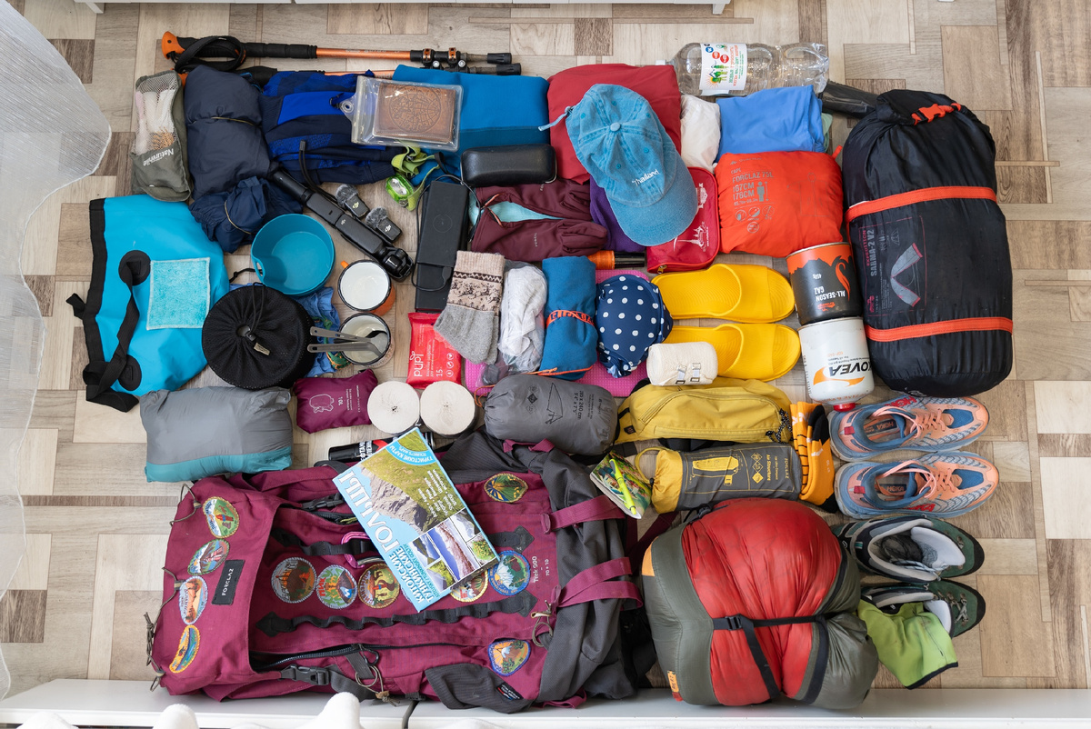 Обувь – горные ботинки, легкие кроссовки для бродов, тапки для лагеря.