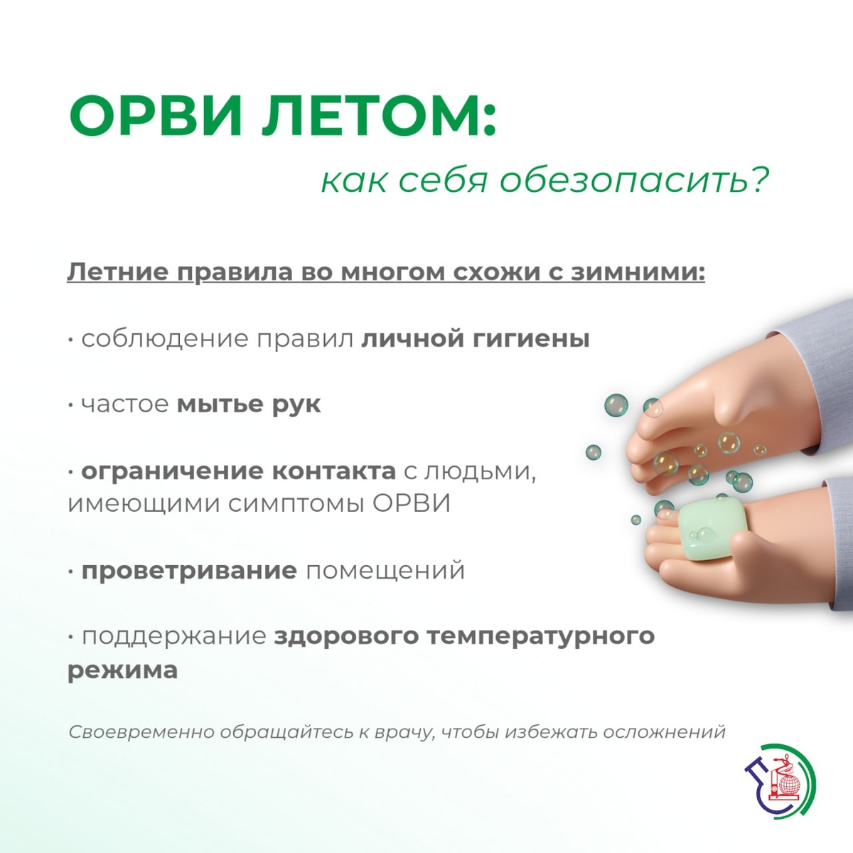 #Санпросвет о профилактике ОРВИ летом 🦠Хотя многие вирусы активны преимущественно в холодное время года, некоторые респираторные вирусы сохраняют жизнеспособность и в теплой, влажной среде. Следовательно, риск заражения ОРВИ летом сохраняется В целом, летние правила во многом схожи с зимними: 🔘соблюдение правил личной гигиены 🔘частое мытье рук 🔘ограничение контакта с людьми, имеющими симптомы ОРВИ 🔘проветривание помещений и поддержание здорового температурного режима Кроме того, летние месяцы – это время отпусков и путешествий. Смена климата, длительные перелеты и пребывание в местах скопления людей могут ослабить иммунитет и повысить восприимчивость к респираторным инфекциям. Поэтому, отправляясь в поездку, важно позаботиться о своей безопасности и заранее принять профилактические меры Профилактика всегда лучше лечения, и проявление заботы о своем здоровье – это залог активного и полноценного лета 🔬 @cge_amur