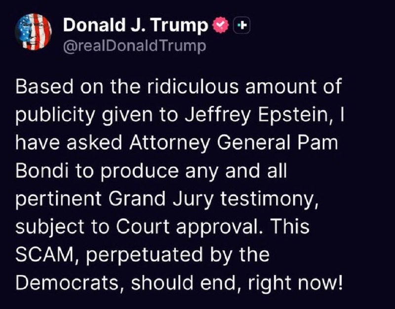 ⚡️ Trump ORDERS AG Pam Bondi to release ALL of the Jeffrey Epstein Grand Jury testimony