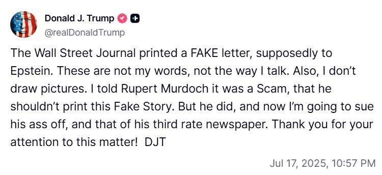 В ответ на пост Trump DOUBLES down on suing WSJ: ‘These are not my words, not the way I talk Also, I don’t DRAW pictures’ ‘I told Rupert Murdoch it was a Scam, that he shouldn’t print this Fake Story’