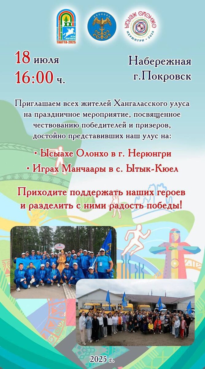 Приглашаем всех жителей и гостей Хангаласского улуса на чествование победителей и призеров Игр Манчаары и Ысыаха Олонхо - 2025 на Набережной города Покровск! @Новости газеты «Хангалас»