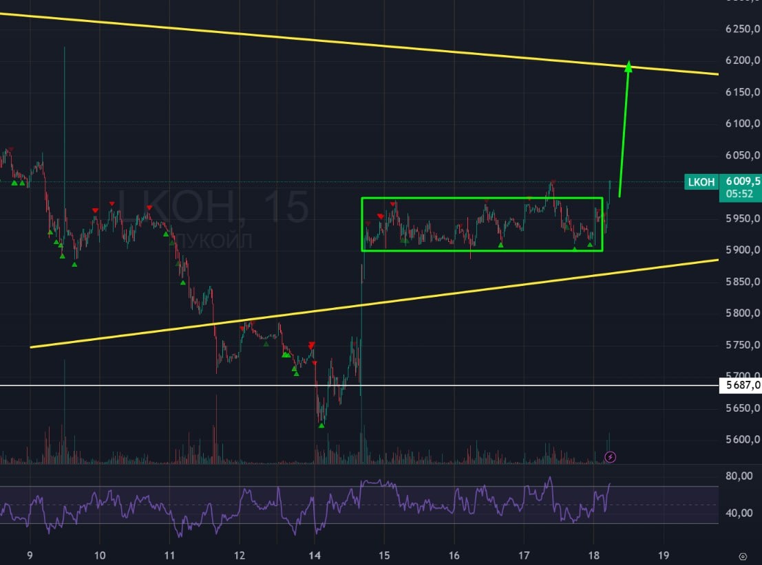 🟢 Лукойл последние дни стоял в боковике. Боковик - это накопление позиции в лонг или в шорт. Сегодня выходим из накопления вверх. Цели вверху - отработка шипа на 6200 руб. Там же будет проходить сильное сопротивление.
