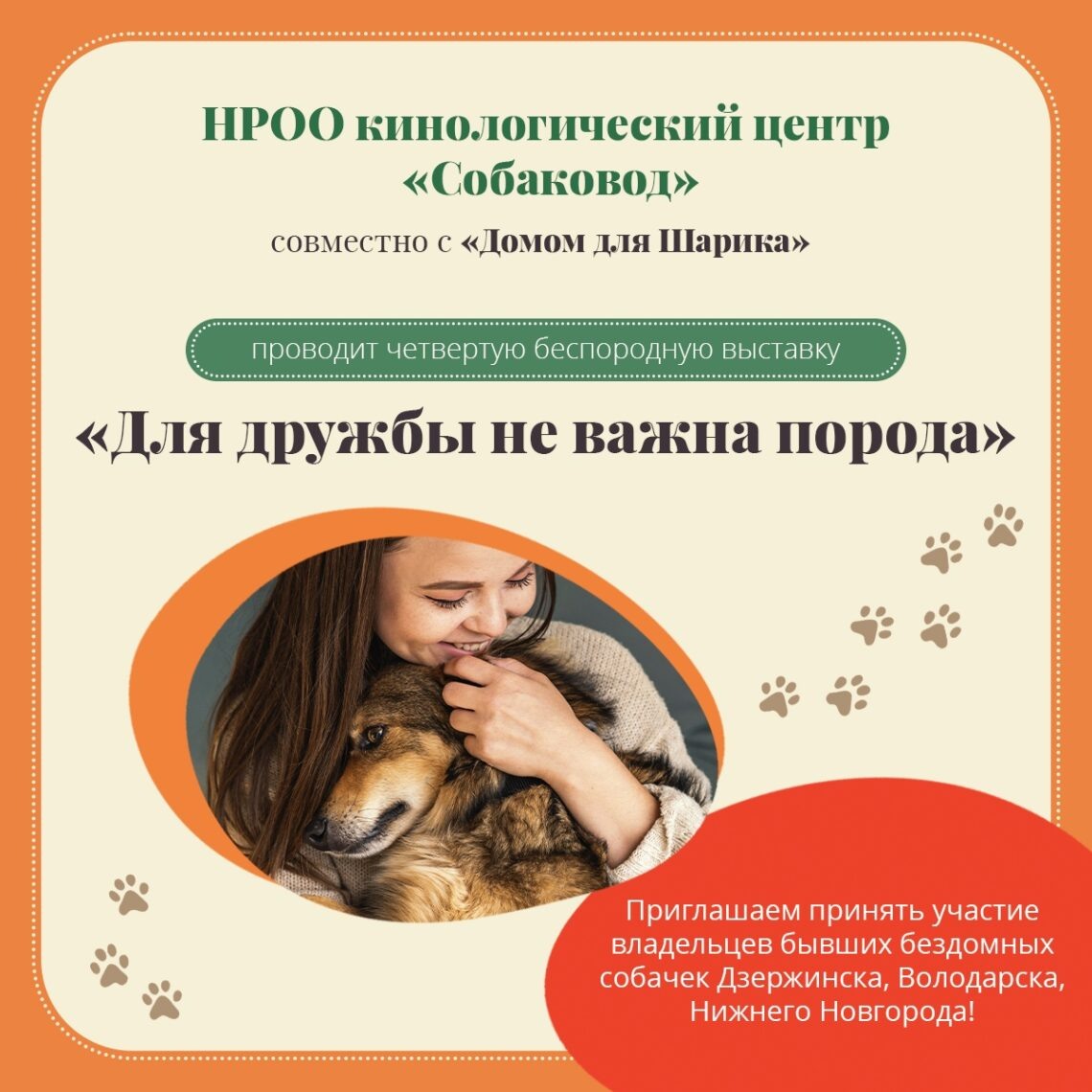 До 10 августа принимаются заявки на регистрацию на четвертую выставку беспородных собак «Для дружбы не важна порода». Организаторы выставки, им выступают ДоброЦентр «Собаковод», волонтеры «Дом для Шарика- НН-Володарск», сообщают, что принять участие в выставке смогут бывшие бездомные собаки и те, кто находится на пристрое в Дзержинске, Володарске, Нижнем Новгороде. Заявку в виде презентации – рассказа о питомце, истории его появления в семье с фото- и видеоматериалами, необходимо направлять в группу в социальной сети ВКонтакте ДоброЦентр «Собаковод». При этом участник должен быть зарегистрированным на Добро.РФ, а профиль в соцсети ВКонтакте должен быть открытым на время проведения заявочного этапа и выставки. Все собаки будут разделены на ринги: щенки – до 9 месяцев, ветераны – собаки с 7 лет, мелкие, средние, крупные собаки. Победители и призеры будут выбраны в каждом ринге.