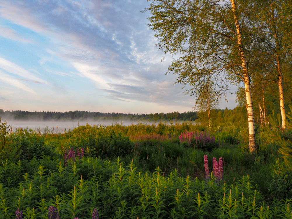 Рассказ о ночной поездке за серебристыми облаками, плавно перешедшей в любование восходом солнца на Валдайском озере прервался на том, что финальную часть путешествия посвятил июньскому разнотравью, главный герой которого символ июня - люпины. Утро было многообещающим в плане возможности увидеть красивые пейзажи. Поспешил направиться к тому месту, где каждый год в начале июня расцветали люпины и устилали берег озера фиолетово-бордовым ковром. Тут можно было долго бродить, наслаждаясь нереальными красками. Белый купырь разбавлял интенсивные цвета люпинов, и привносил разнообразие в утреннюю палитру. Еще отдельное спасибо красивому небу. А вот в поле за деревней уже купырь правил бал. Он покрыл обширное пространство с яркими вкраплениями люпинов. При большом скоплении купырь источает тончайший аромат, который обволакивает и дурманит. Это чудесное утро запечатлел на видео. Надышавшись цветочным ароматом и налюбовавшись волшебным полем, ничего не оставалось делать, как отправиться домо