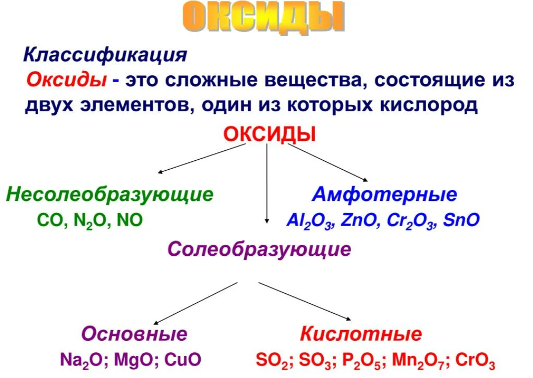 Оксиды — это бинарные соединения, состоящие из кислорода (O) и другого элемента. Общая формула: Э₂Oₙ, где Э — элемент, n — степень окисления кислорода (обычно -2). Формула оксида зависит от степени окисления элемента. Сумма степеней окисления всех атомов в оксиде должна быть равна 0. Алгоритм: Пример: Высший оксид — это оксид, в котором элемент проявляет наивысшую степень окисления (обычно равна номеру группы в таблице Менделеева). Правило: Примеры высших оксидов: Элемент Группа Высшая степень окисления Формула высшего оксида Сера (S)VI (16)+6SO₃Азот (N)V (15)+5N₂O₅Хлор (Cl)VII (17)+7Cl₂O₇Углерод (C)IV (14)+4CO₂Фосфор (P)V (15)+5P₂O₅ Если нужны примеры по конкретным элементам — спрашивай! 😊 напиши пожалуйста все про оксиды амфотерные кислотные основные как их составлять напиши статью Оксиды — это соединения элементов с кислородом (O⁻²). Они делятся на основные, кислотные, амфотерные и несолеобразующие. Тип оксида Характер Примеры Основные Реагируют с кислотами, образуя солиNa₂O, CaO,