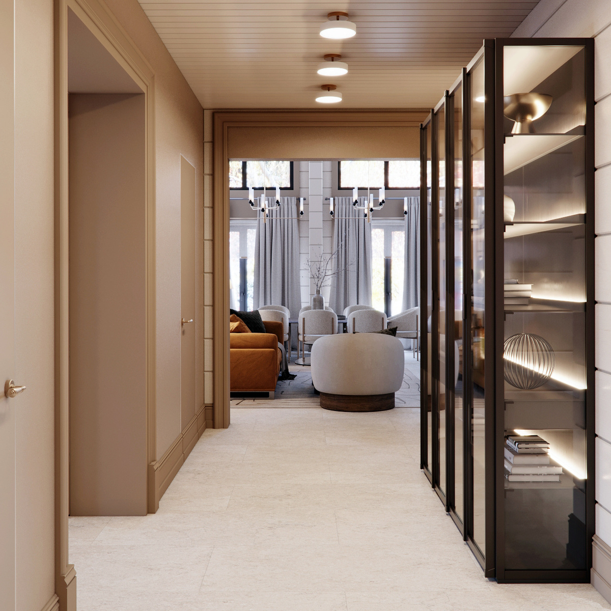 Коридор на первом этаже объединяет в себе функциональность и эстетику. По желанию заказчиков, мы отказались от идеи зашить пространство под ступенями ради увеличения зоны хранения — вместо этого реализовали более лёгкую конструкцию без подступенков, но с аккуратной подсветкой. Под лестничной площадкой осталась скрытая зона хранения с распашными фасадами — туда удобно убрать, например, пылесос. Дополнительно можно предусмотреть выдвижные ящики у основания. Такая идея уже опробована нами в одном из загородных домов и отлично себя показала. Проходы и порталы облицованы декоративными панелями в верхней части — это не только эстетика, но и практическое решение: панели позволяют компенсировать возможные деформации при усадке деревянного дома. Мы заранее учитываем такие нюансы, чтобы интерьер не только выглядел эффектно, но и служил долго без лишних доработок. Высокий витринный шкаф создаёт вертикальный акцент, а внутри можно расставить красивую посуду или книги, подчёркивая уют и статус прос