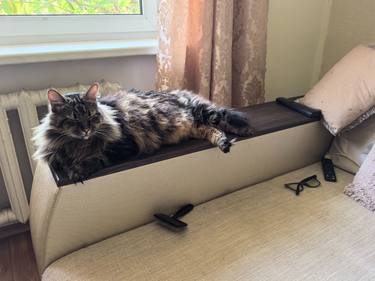 Всем привет! С вами Кузя Кусалочкин (он же царь Кузьма I). Сегодня я расскажу, как мои хозяева проспали, но всё равно успели. Утро началось в 5 часов. Просто я всё съел, что мне на ночь оставляли, и был голоден. Пришёл к хозяйке просить еду. Она сначала не хотела так рано вставать, но в итоге сдалась, и царю (то есть мне) был подан паштет на царской тарелке. На новые каналы я сейчас не подписываюсь. Дружить, забежать в гости времени нет. Хозяйка решила дальше идти спать (или хотя бы полежать), уснула и проспала, не слышала будильник. Но в итоге успела приготовить хозяину завтрак вовремя. А хозяин тоже проспал. Будильник у него не прозвенел, или он его выключил и продолжил спать. Точно не знаю. В общем, все проспали, но все всё успели. Один я не проспал и получил второй раз паштетик. Хозяин ушёл на работу. Хозяйка занималась своими делами, а я лежал на диване: Хотел телик посмотреть: Залез в настройки. Но хозяйка пришла и выключила. Так повторилось три раза. На третий раз хозяйка отоб
