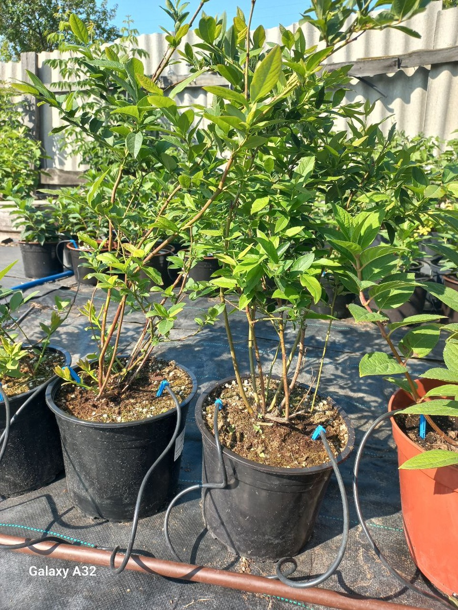 Вот так сейчас выглядят саженцы голубики. Они были пересажены в 3 и 5 литра.