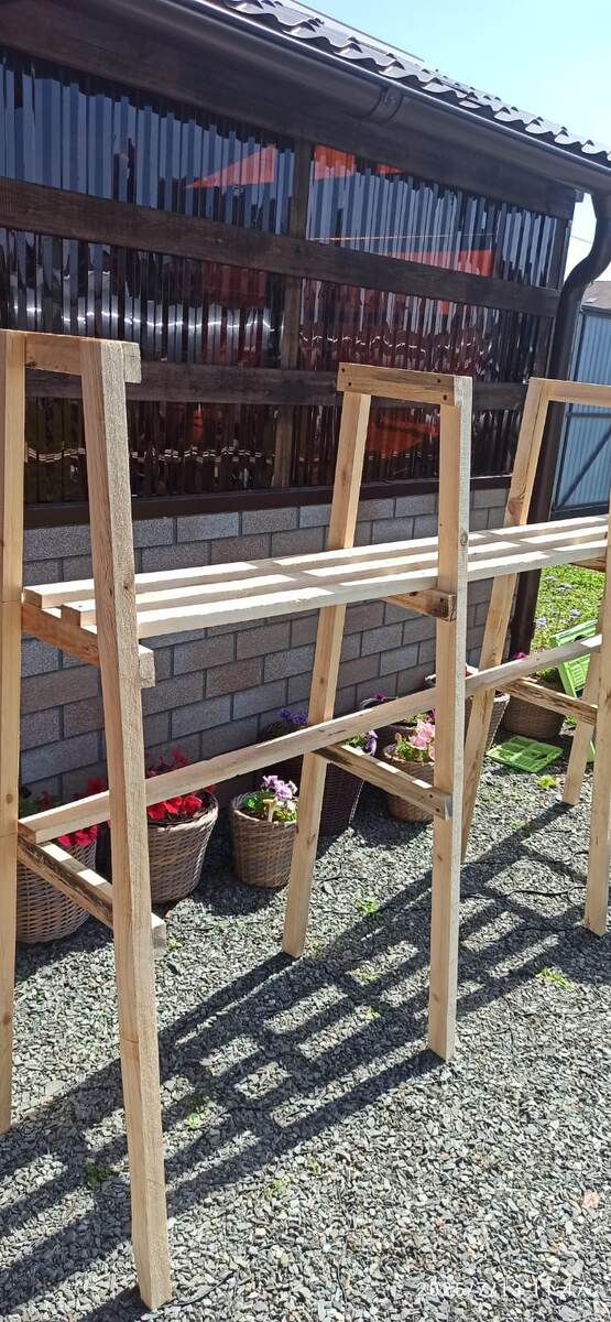 Любой конфликт между двумя близкими людьми желательно заканчивать на конструктивной ноте. Вот и у нас так получилось. А результатом стал стеллаж для рассады под клубнику. С чего все началось. Как обычно выходные. Строишь планы (свои) по обустройству участка. Надо летнюю кухню доделать, по теплице куча дел, траву покосить и прочее, прочее. А тут жена со своими запросами. Сделай стеллаж под рассаду. Какой стеллаж? Зачем? Побурчал, побурчал, но не откажешь. Перспектива остаться без обеда так себе)). Тем более за летним домиком пустует хорошее место. Пришлось в ход пустить доску (дюймовку) шириной 10 см. Распустил доски на 2 половины шириной в 5 см. Из них и стал делать стеллаж. Сам процесс описывать, наверно, смысла нет. Все видно на фото. Высоту сделал 1 метр 40 см, чтобы верхняя часть стеллажа также могла активно использоваться. Получилось 4 уровня. Нижний - земля. Примерили цветы. Тоже вполне достойно может смотреться такой стеллаж, но в другом размере. Рассада будет размещаться в с