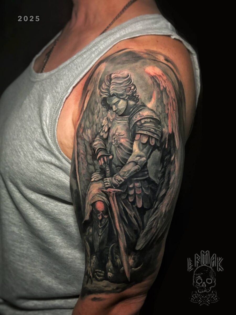Оберег в образе Ангела: Спаситель и Помощник В мире татуировок существуют символы, которые не только украшают тело, но и служат мощным оберегом. Одним из таких символов является татуировка Ангела, убивающего беса. Этот образ не только поражает своим эстетическим эффектом на плече, но и несет в себе глубокий смысл, который способен защитить вас от всех невзгод и привести к гармонии в жизни. Ангел, побеждающий зло, символизирует внутреннюю силу и желание справиться с трудностями. Именно поэтому он помогает владельцу пребывать в уверенности во всех начинаниях и обретать мир в семье. Такой талисман может стать не просто украшением, а истинным наставником на жизненном пути. Татуировка Ангел-хранитель — это не просто изображение, это ваш верный спутник в любой ситуации. Готовы ли вы получить такую поддержку❓ Задумайтесь над тем, какой смысл вы хотите вложить в ваше следующее тату, и пусть ваш выбор станет мощным источником вдохновения и защиты. #иванермак #татуермак #ангелхранитель #тат