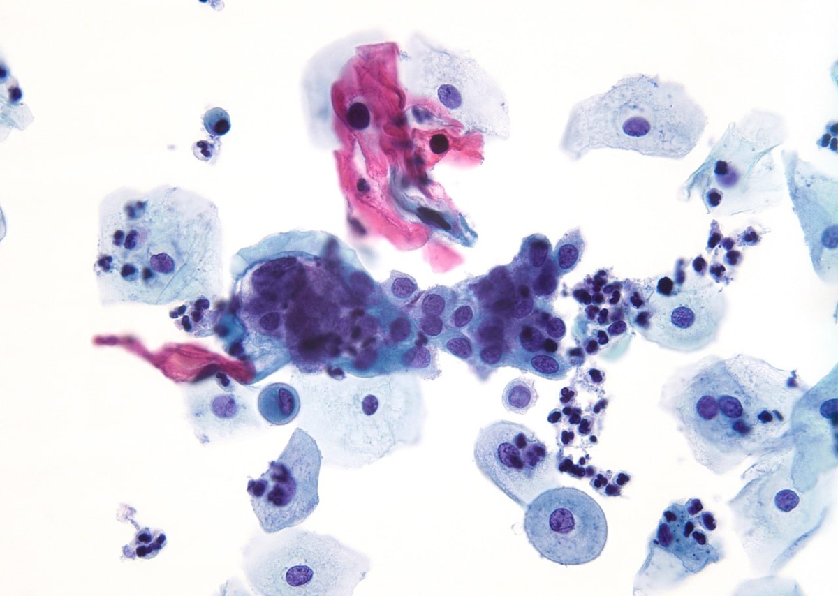 Цервикальный мазок «все в одном» от молодой пациентки. Типичная цитоморфология обширного LSIL с многочисленными ядрами-восьмерками и немного HSIL. Препарат, приготовленный методом жидкостной цитологии (ThinPrep). Окрашивание по Папаниколау. Объектив 40x. #пап #цитология #цервикальнаяцитология