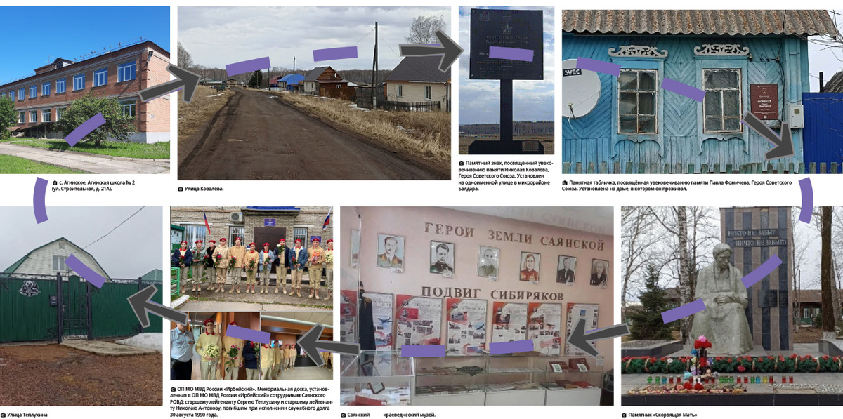 Отправление: с. Агинское, Агинская СОШ № 2 (ул. Строительная, д. 21А) – памятный знак, посвящённый увековечиванию памяти Героя Советского Союза Николая Ковалёва (ул. Ковалева, д. 3) – памятная табличка, посвящённая увековечиванию памяти Героя Советского Союза Павла Фомичева, (ул. Фомичева, д. 20) – мемориальный комплекс «Скорбящая Мать» (ул. Советская) – Саянский краеведческий музей (ул. Советская, д. 138) – ОП МО МВД России «Ирбейский» (ул. Красноармейская, д. 62) – улица Теплухина, названная в честь старшего лейтенанта Сергея Теплухина, погибшего при исполнении служебного долга 30 августа 1990 года – МБОУ «Агинская СОШ № 2» (ул. Строительная, д. 21А).