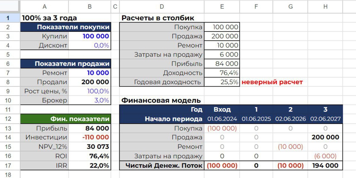Не усложняй нелёгкую жизнь или Зачем инвестору «сложная» фин.модель можно же проще считать? 🤓 Многие инвесторы в недвижимость (и даже инициаторы проектов) оценивают долгосрочные, длящиеся более года, проекты, просто создав табличку с подсчетами доходов и расходов в столбик. Такой подход кажется простым, но он может быть неточен и опасен. Проблемы подсчетов в столбик: 🔸Не учитывается время. Деньги, вложенные сегодня, стоят дороже, чем те же деньги через 2-3 года. 🔸Рассчитывается рентабельность проекта вместо необходимых метрик вроде IRR и NPV. 🔸Невозможно корректно рассчитать годовую доходность - деление доходности на 2 или 3 (в зависимости от количества лет в проекте) является грубейшей ошибкой. 🔸Неинформативно: нет важных элементов расчетов, например, инвестор может не видеть периоды, когда проект требует дофинансирования. Преимущества грамотной финансовой модели: 🔹Все денежные потоки посчитаны правильно по периодам с учетом ценности денег во времени. 🔹Есть полная картина: в