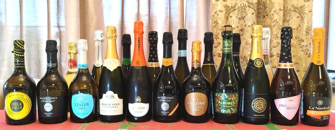 На общем фото вы увидите лишь 19 игрист ых, ибо 2 игристых (Martini Prosecco Rose и Fanagoria Brule Cuvee белое) я дегустировал сравнительно недавно и в обзоре использую уже сделанные мной отзывы с оценками.