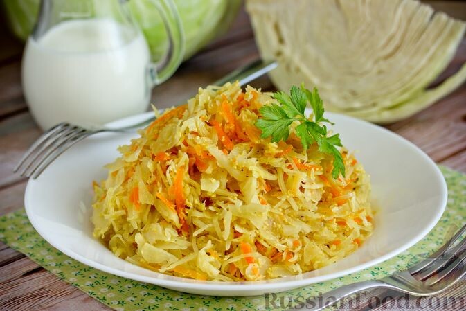 Капуста, тушенная в кефире. Белокочанная капуста, тушенная в кефире, — полезное и достаточно диетическое блюдо. В готовом виде капуста получается очень мягкой, сочной и, что самое интересное, она приобретает приятную кислинку, создаётся такое впечатление, что к свежей капусте добавлена ещё и квашеная. Куркума придаёт капусте красивый жёлтый цвет, а тмин — характерный аромат и интересное послевкусие.