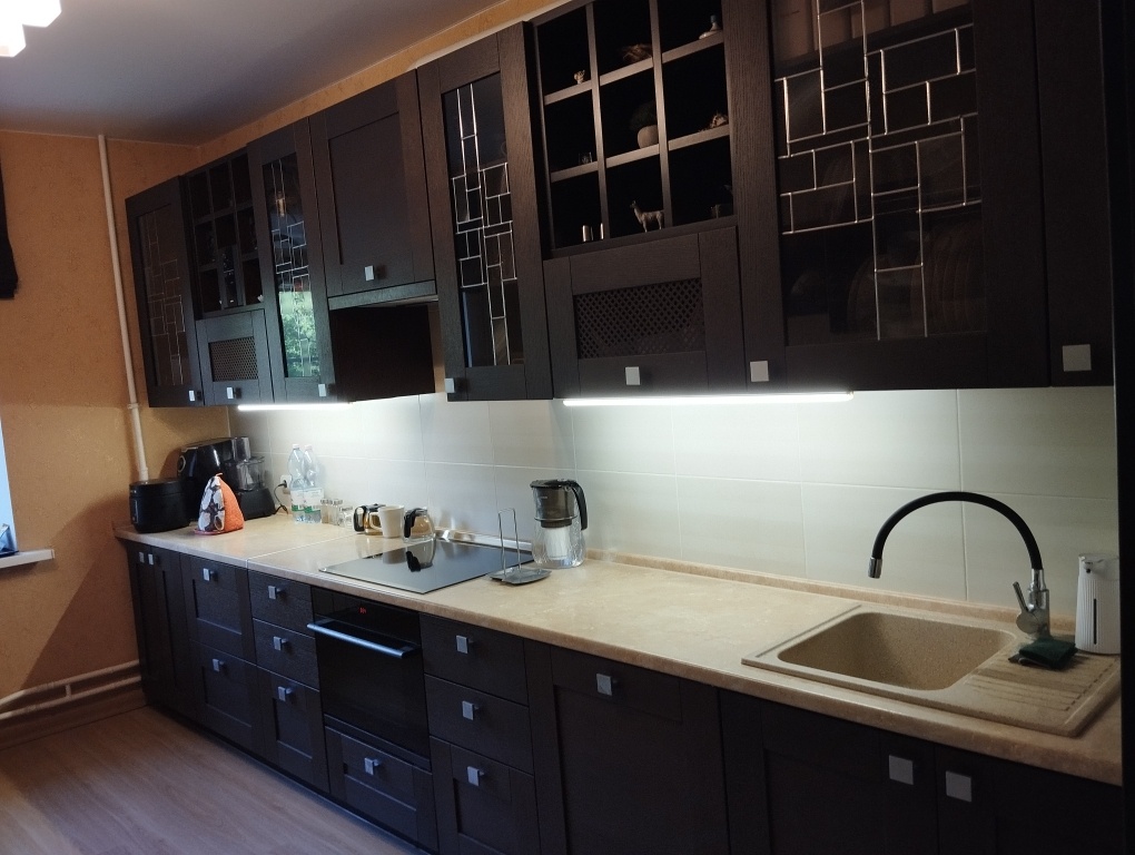 В эту квартиру мы переехали в 2014 году. Мы купили новостройку в бетоне. Делали ремонт с нуля. Получается, живем 11 лет и никаких проблем с кухней не было. Заменили пару раз петлю у шкафчика с мусорным ведром, который открываем по сто раз на дню. Мне нравится темная мебель, светлую кухню я даже не рассматривала. Я пересмотрела множество кухонь в Интернете, и наконец нашла ту, которая понравилась. Она называется Токио. Салон расположен в другом городе, это у них была первая кухня в Нижнем Новгороде. Фасады из Италии, а корпуса они делали сами, именно те, что нужны нам. Один фасад мы меняли и ждали его полгода, пока привезут. Кухня симметричная относительно плиты и духовки, расположенных в центре. Длина 4.2 метра. Фасады цвета венге из натурального шпона. Еще витражи со стеклами и цветной пленкой. Еще я хотела открытые полочки, чтобы поставить какие-то сувениры. И духовка у нас низкая, она совмещена с СВЧ-печкой. Зато под ней есть ящик, куда можно положить противни и формы для выпечки.