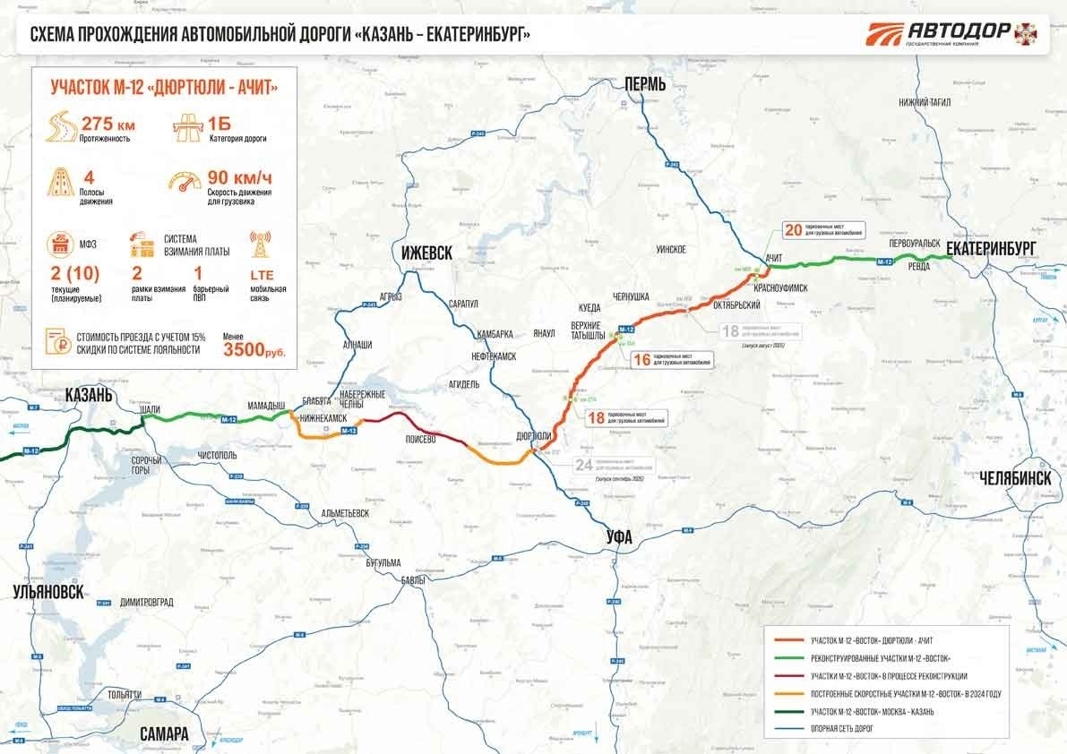 Эксперты Росавтодора ответили на самые важные вопросы, касательно федеральной автодороги М-12 «Восток» Дюртюли – Ачит, протяженностью 275 километров, из которых 140 километров находятся в Башкирии. По информации ИА «Башинформ», в среду, 16 июля, президент страны Владимир Путин в формате видеоконференции запустил движение на этом участке трассы. В торжественном мероприятии участвовал и руководитель Башкирии Радий Хабиров. Он отметил, что на сегодняшний день планируется довести до первой категории проезд от столицы Башкирии до М-12 (федеральная дорога Р-240-подъезд к М-12). Средства на эту работу выделили, конкретные участки дороги находятся на этапе проектирования. В перспективе работа рассчитана на шесть лет. Трасса М-12 «Восток» Дюртюли – Ачит относится к скоростным четырехполосным автодорогам с транспортными развязками. Выехав на нее, можно без светофоров добраться на восток до Екатеринбурга, в видимой перспективе - до Тюмени, в будущем – до Китая. Западное направление ведет до Каз