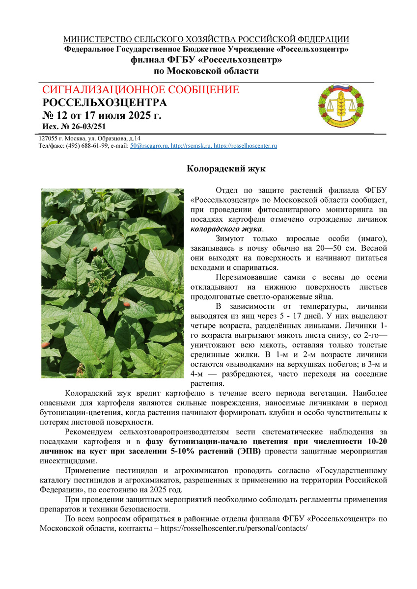 Сигнализационное сообщение Россельхозцентра – Колорадский жук №12 от 17 июля 2025 г.
