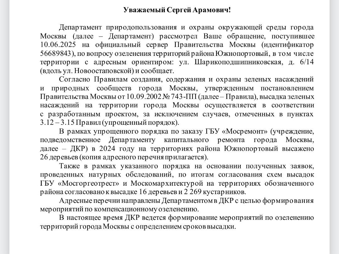 "Сражение" за озеленение района Южнопортовый продолжается!!! ✅Всё Обращения были не напрасны! Остаётся только, чтобы довели все до конца и наш район увидел новые деревья и кустарники. А их на секундочку не много, но и не мало 🌳🌳🌳16 деревьев 🪴🪴🪴2269 кустарников. Архитектурный облик района постепенно меняется многочисленными строительствами новых домов, как в рамках реновации так и появления жилых комплексов. Поэтому работы по ещё большему увеличению посадок деревьев должны быть в приоритете в рамках нашего района! Будем ждать адресной перечень по компенсационному озеленению в Южнопортовом!!! #ЛДПР #Южнопортовый #БагянСергей