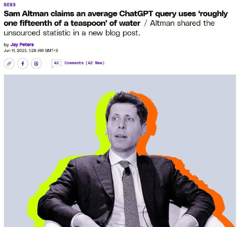 ЭКОЛОГИЧНОСТЬ ИИ⚡️ Сэм Альтман посчитал, сколько воды нужно ChatGPT для обработки одного запроса! И поделился интересной цифрой: на один запрос к ChatGPT уходит примерно 1/15 чайной ложки воды — это около 0,32 мл. 👉🏻Для сравнения: ещё два года назад GPT требовалось до полулитра воды на 20–50 промптов — от 10 до 25 мл на каждый. Прогресс в энерго - и водоэффективности на лицо. ИИ становится не только умнее, но и экологичнее. @shvedkovpro #ИИновости