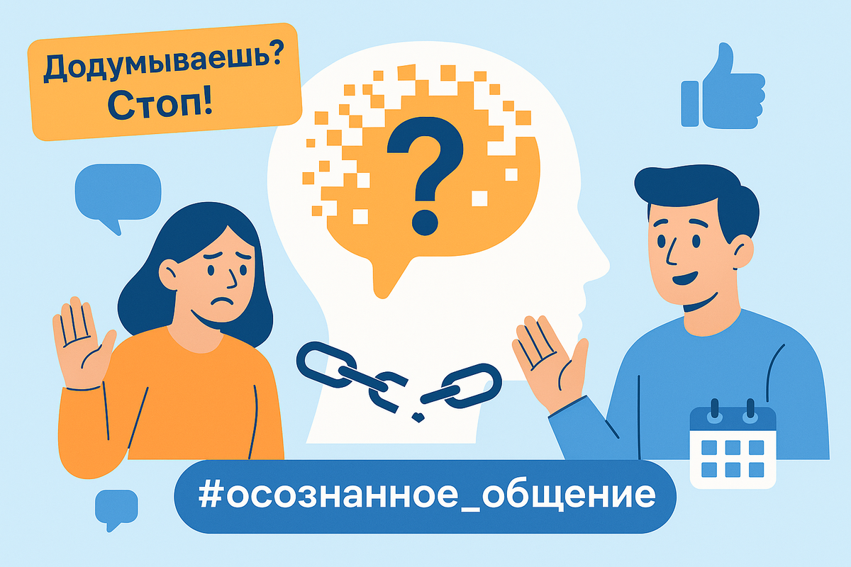 Схема: Заметили додумывание: «Мой друг уже неделю не звонит. Наверное, я его чем-то обидел(а)...» → Сформулируйте нейтральный вопрос (без обвинений и подтекста): «Я заметил, что мы давно не общались. Все в порядке?» (вместо: «Ты что, обиделся на меня?») → Примите любой ответ: даже если он не совпадет с вашими ожиданиями.