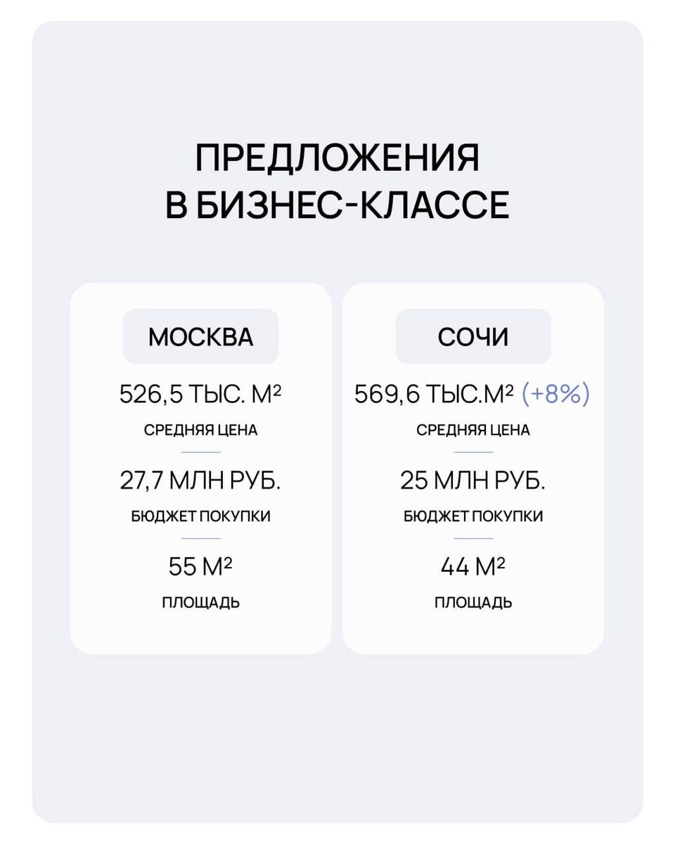 Случается, что перед моими клиентами возникает дилемма: где брать?!!! Один из аргументов ⤵️ ♻️Эксперты премии URBAN и аналитический центр ФД «Неометрия» сравнили новостройки бизнес-класса в Москве и Сочи. Думаете столица лидирует? Результаты говорят об обратном: ▪️Цены выше на 8% в Сочи, чем в столице. ▪️Обязательные опции на юге: бассейн, спа-центр, консьерж-сервис и доверительное управление. ▪️В Москве из 150 проектов только 64% соответствуют стандартам бизнес-класса, в Сочи — 52% из 32. Почему так? На юге спрос диктует курортный комфорт: аква-зоны, террасы, охлаждение территории. В Москве критичны локация, парковки и инфраструктура. Ольга Хасанова, CEO URBAN: «Региональный девелопмент во многом не только не уступает, но и превосходит столичные проекты, и Сочи — яркий тому пример».