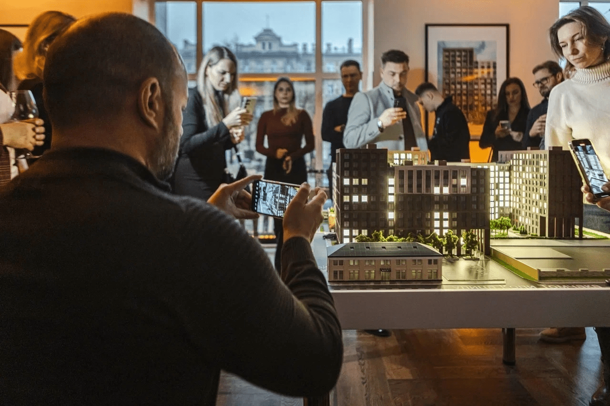 Далее провели серию встреч - презентации жилищного комплекса, которые отличались от традиционных: не устраивая грандиозное шоу с фейерверками, мы организовали ряд камерных мероприятий для коллег, партнеров и дольщиков застройщика. Каждому участнику было уделено достаточно времени (индивидуальный подход), без акцента не массовый рынок.