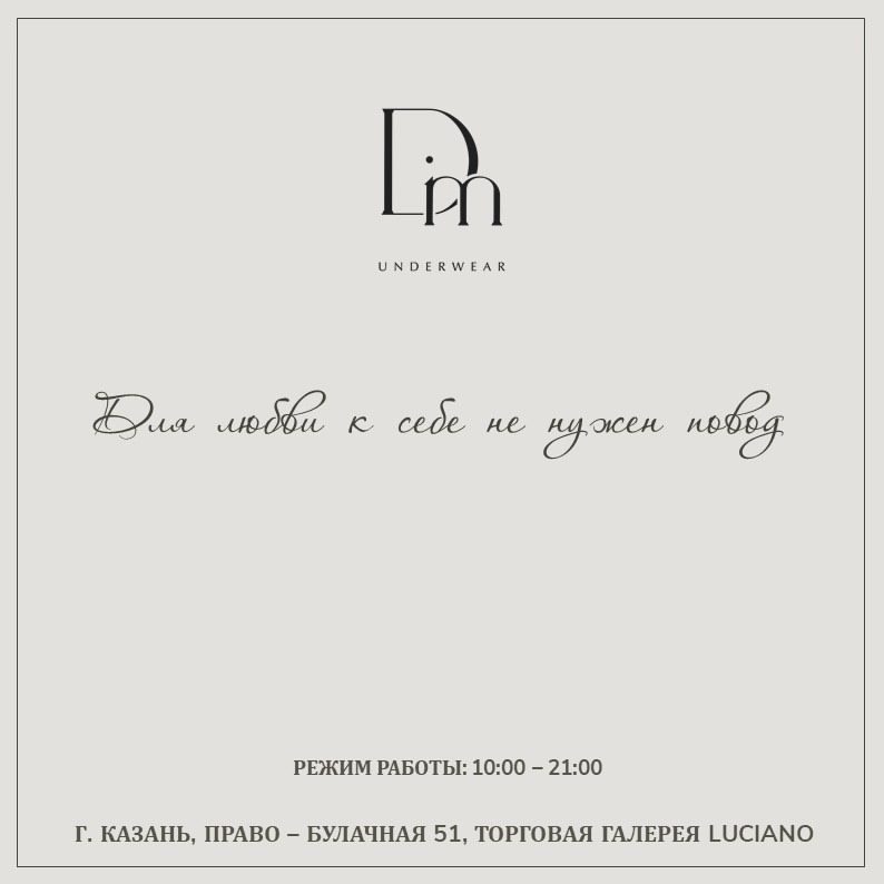 1. Мы сделали ребрендинг, и теперь мы не DIM, а Dimmi underwear. Становимся лучше для Вас с каждым днем. 2. Мы переехали, и находимся по новому адресу: г. Казань, ул. Право-Булачная 51, торговый дом LUCIANO 3. Теперь вы можете сделать заказ на нашем официальном сайте Dimmi underwear с примеркой и доставкой по всей России. Так же у вас есть возможность разделить платеж и оплатить заказ долями. Dimmi Underwear — премиальное нижнее белье, домашняя одежда и пляжные комплекты мировых брендов, созданные с любовью и вниманием к каждой детали. Мы предлагаем изысканные модели, которые сочетают в себе высококачественные материалы, современный дизайн и безупречное исполнение. Наша цель — предоставить возможность чувствовать себя уверенно и стильно в любой ситуации, будь то повседневная жизнь или отдых на пляже. В Dimmi Underwear мы придерживаемся принципов качества, устойчивости и инклюзивности. Мы тщательно отбираем модели белья мировых брендов, чтобы гарантировать долговечность и комфорт. Бель