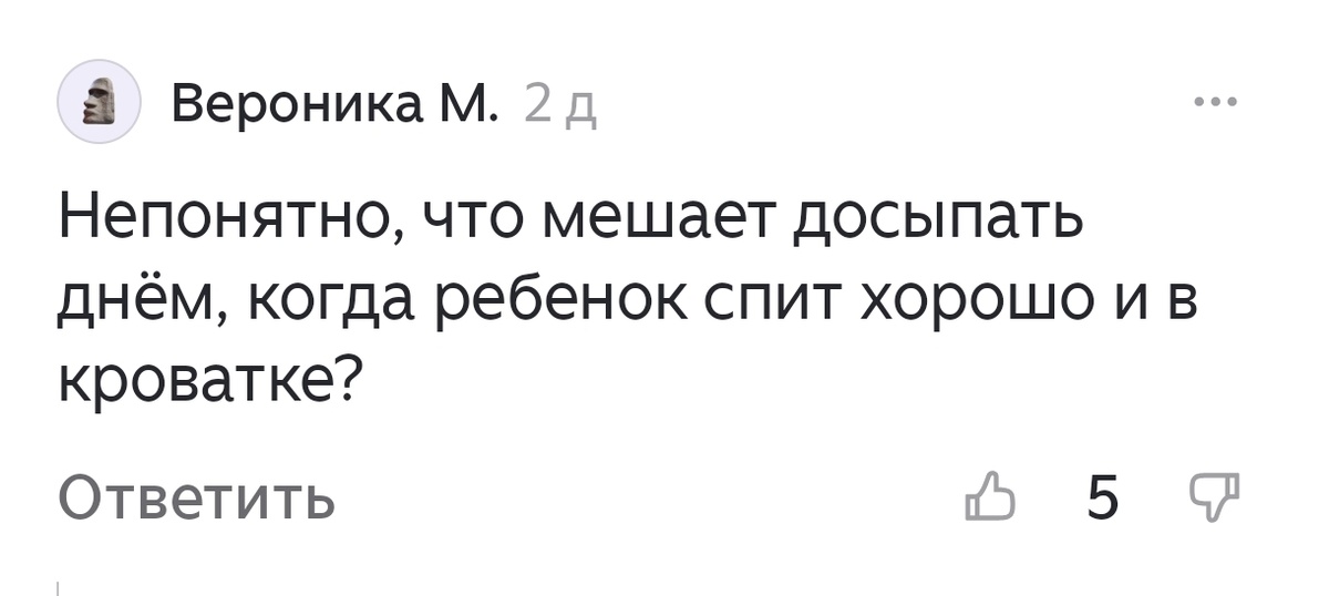 Я тоже думала, что всё подождёт, я буду спать одновременно с ребёнком и тогда точно за день буду набирать свою норму сна, ведь мне нужно явно меньше, чем младенцу. Но мой организм не выносит пока такой прерывистый сон: для меня просыпаться каждые 20 минут - это пытка, поэтому организму проще не спать совсем, а расслабляюсь я и вырубаюсь в основном только когда муж забирает ребёнка и ответственность за него на себя. Так я выигрываю ещё час сна. Но опять же, если цикл сна длится 90-110 минут у взрослого человека, то когда ты спишь только 60 минут, то ты не уходишь в глубокий полноценный сон, когда и происходит основное восстановление.