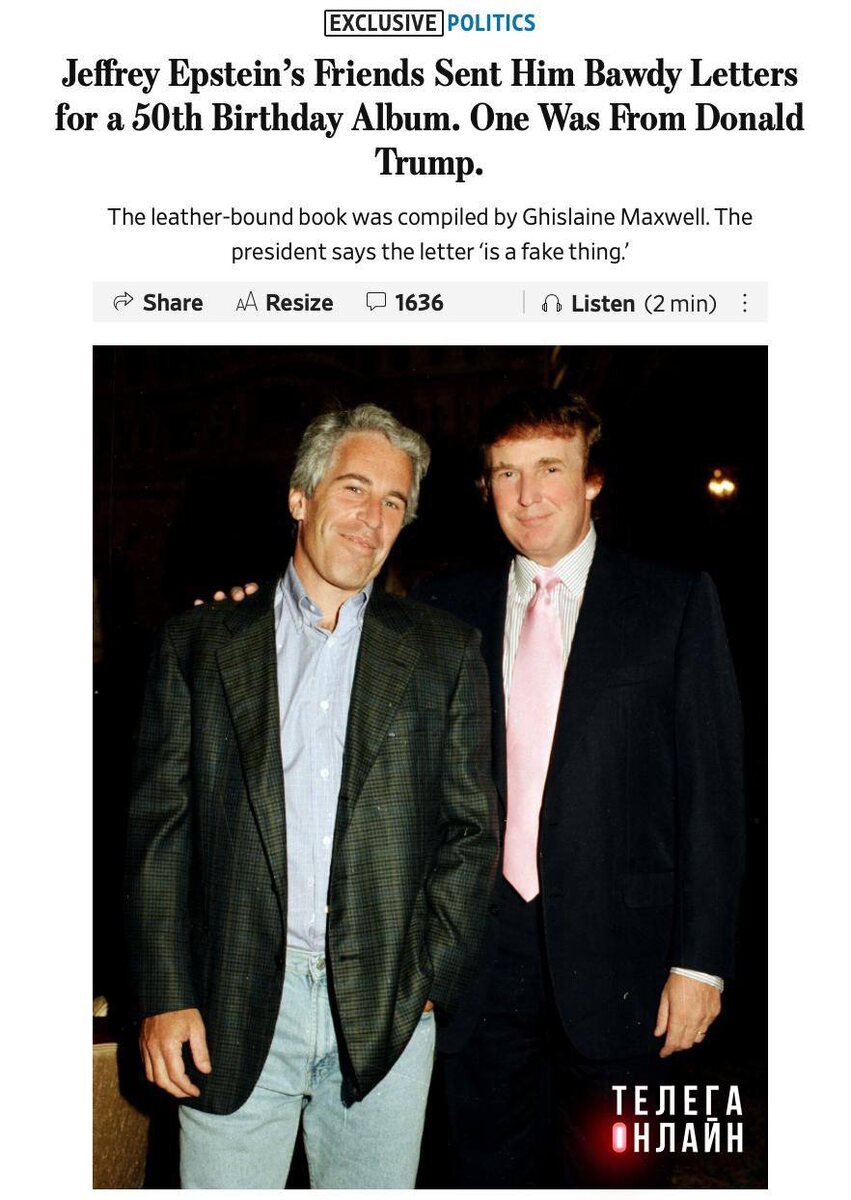 Привет из прошлого The Wall Street Journal пишет, якобы Трамп в свое время поздравлял миллиардера-педофила Эпштейна с 50-летием открыткой с нарисованной от руки голой женщиной. Правда, копию рисунка не опубликовали, а сам Дональд все отрицает и грозит судом. Когда хотел по-тихому все замять, а вместо этого раздул скандал сильнее. 🚲 Подпишись на Телега Online