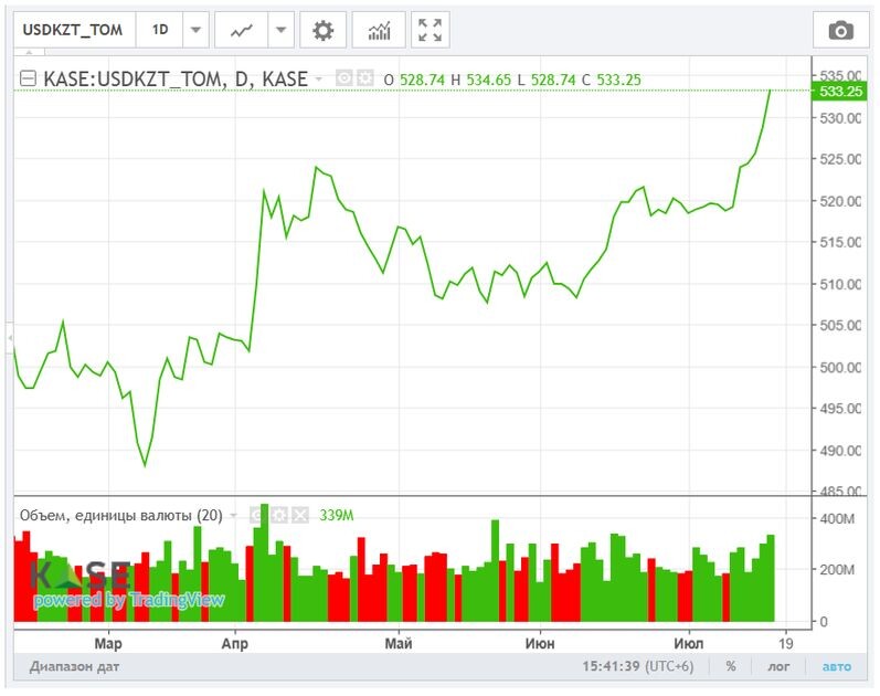 Обзор рынков подготовили аналитики Ассоциации финансистов Казахстана (АФК). Курс доллара ускорил рост в четверг в отсутствие каких-либо фундаментальных причин, приближаясь к новому бюджетному ориентиру на следующий год (540 тенге за доллар). По итогам торгов четверга курс по паре USD/KZT составил 533,07 тенге за доллар, показав рост на 6,38 тенге. При этом объём торгов продолжил расти – до 339,2 млн долларов (+38,3 млн). Очевидно, что в данный момент отчасти ажиотажный спрос на инвалюту значительно превышает её предложение. В таких условиях поддержку курсу тенге могут оказать приостановка покупок долларов для ЕНПФ (валютная переоценка сделает портфель выше), увеличение продаж инвалюты в рамках зеркалирования и обязательной конвертации валютной выручки субъектами КГС, а также словесные интервенции НБРК. Из опубликованной статистики отметим, что индекс СЗПТ за неделю, завершившуюся 15 июля, вырос до 100,1 пункта с показателя в 100,0 пунктов ранее. Сегодня в фокусе внимания – публикация д