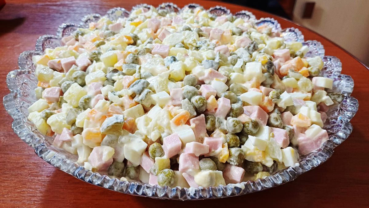 Всем привет! Я к вам с рецептом вкусного классического салата оливье. Этот салат готовят по разным рецептам. У каждой семьи есть свой вариант приготовления этого салата. Наш любимый рецепт именно такой : 4-5 отварных картошки режем кубиком. 4-5 маринованных огурца нарезаем так же кубиком. Далее консервированный зелёный горошек без рассола отправляется в салат. Варёная колбаска режется всё так же кубиком. Репчатый лук мелко режем и добавляем к другим продуктам. Какой же оливье без варёных яиц,3 шт режем кубиком. Немного подсаливаем и добавляем майонез. Кто-то делает заправку из сметаны+майонез в равных пропорциях. Мы любим с майонезом. Всё перемешиваем. Вкусный,красивый,яркий,аппетитный салат оливье готов. Красота и вкуснота👍😋 Всем приятного аппетита! Хорошего дня и отличного настроения!🤗