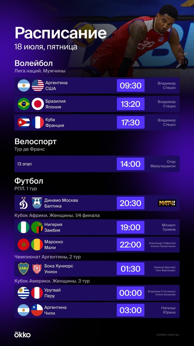 Волейбольная Лига наций, 13-й этап «Тур де Франс», чемпионат Аргентины, возвращение РПЛ, а также женские Кубки Африки и Америки — все это увидишь в наших трансляциях сегодня! 😍 https://okko.tv/s/4ot
