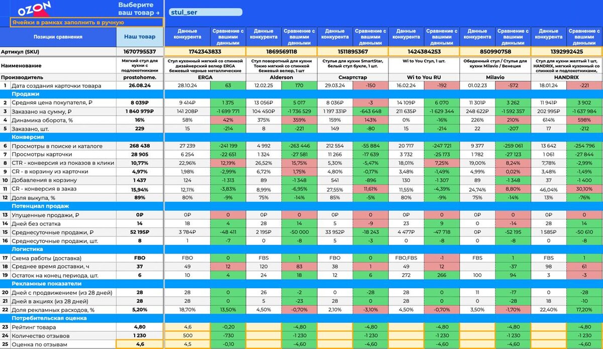 Я с командой создал для вас БЕСПЛАТНУЮ полуавтоматическую таблицу с ключевыми метриками по вашему товару и главным конкурентам на OZON.