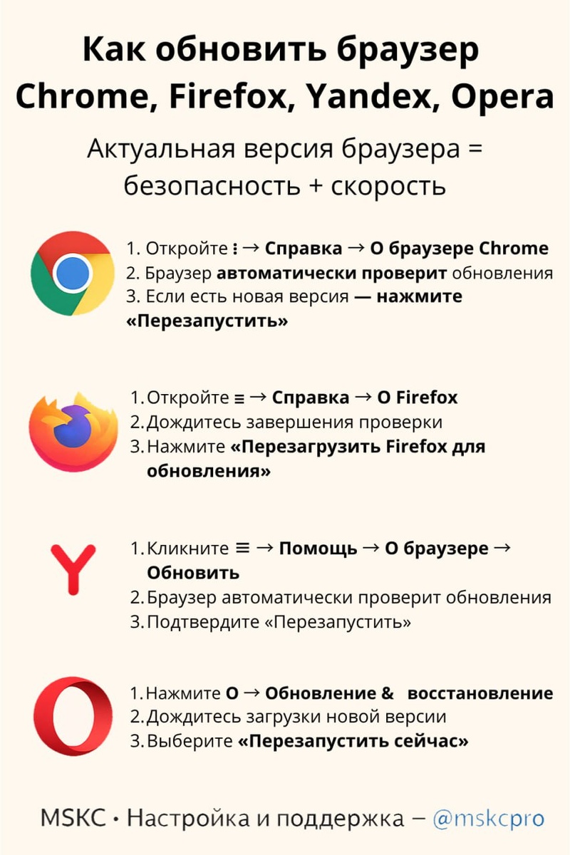🛠 Как обновить браузер: Chrome, Firefox, Яндекс, Opera Актуальная версия браузера = безопасность + скорость. Вот инструкция для всех популярных браузеров: 🔤 Google Chrome 1. Откройте ⋮ → Справка → О браузере Chrome 2. Браузер автоматически проверит обновления 3. Если есть новая версия — нажмите «Перезапустить» Лайфхак: Введите в адресной строке: chrome://settings/help 🔤 Mozilla Firefox 1. Откройте ☰ → Справка → О Firefox 2. Дождитесь завершения проверки 3. Нажмите «Перезагрузить Firefox для обновления» 🔤 Яндекс.Браузер 1. Кликните ≡ → Помощь → О браузере → Обновить 2. Браузер автоматически проверит обновления 3. Подтвердите «Перезапустить» Совет: Обновления приходят раз в 2 недели — не игнорируйте их! 🔤 Opera 1. Нажмите O → Обновление & восстановление... 2. Дождитесь загрузки новой версии 3. Выберите «Перезапустить сейчас» Особенность: Opera обновляется реже Chrome, но стабильнее. ❗️ Почему это важно? ✓ Безопасность: Закрытие уязвимостей ✓ Скорость: Оптимизация работы ✓ С