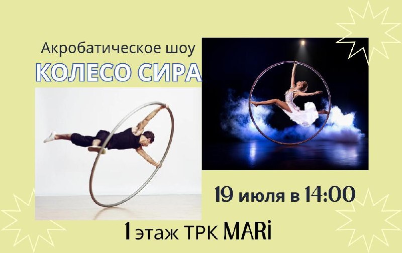 ➡️ Акробатическое шоу «Колесо Сира» 19 июля в 14:00 | ТРК MARi, 1 этаж, ул. Поречная, 10 Вы увидите невероятный и зрелищный цирковой номер Колесо Сира. Это шоу удивит вас фантастическими физическими возможностями человека.. 🧷 Бесплатная Москва