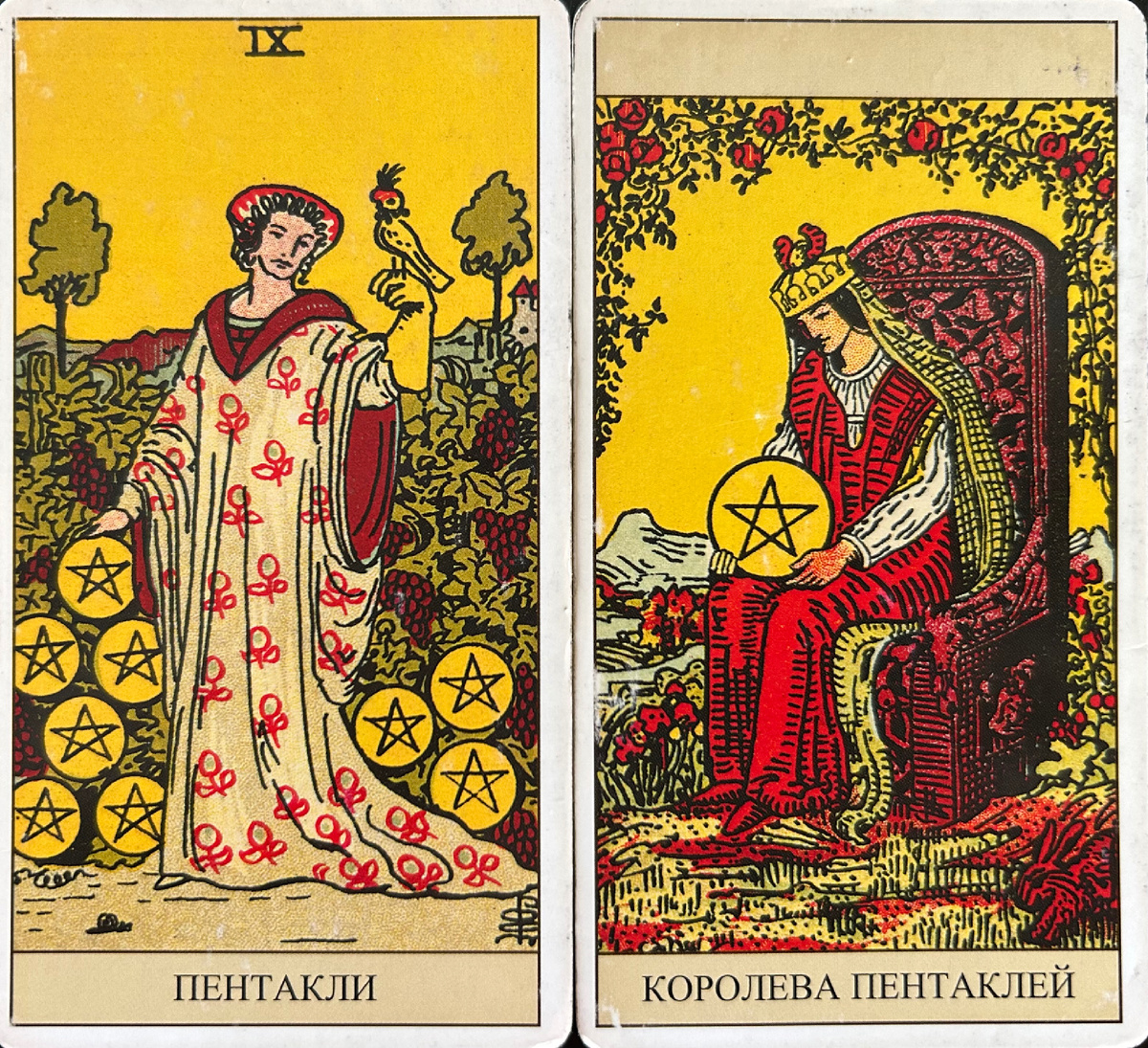 - 9 Пентаклей: гордость, расслабленность, удовлетворение от достигнутого. Много личного пространства.