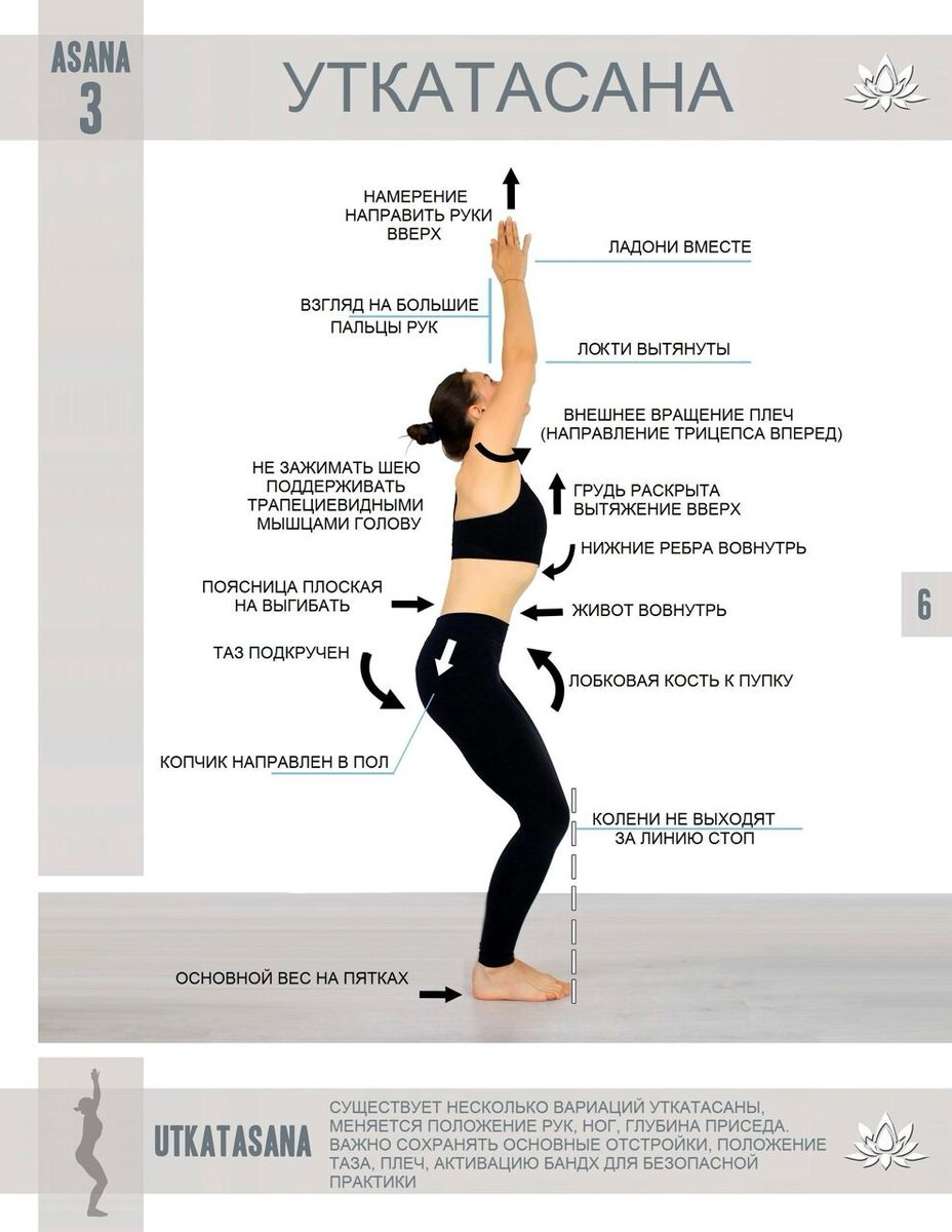 Будьте внимательны, если у вас есть: Всегда адаптируйте практику под себя. Используйте опору или уменьшайте глубину приседа при необходимости. На изображениях — две вариации позы: вид спе