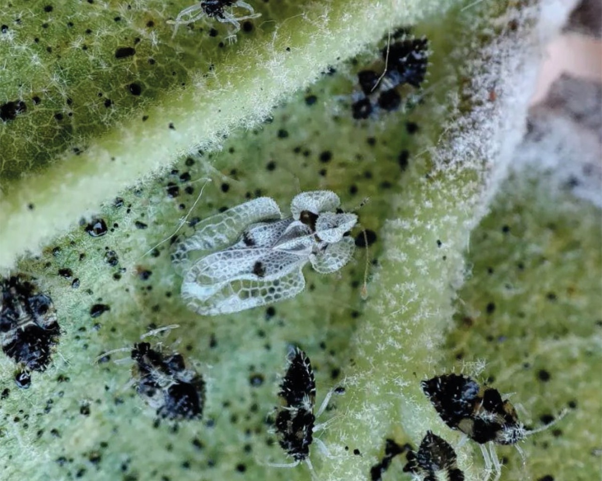 Распознать вредителя проще, чем кажется. Еще вчера зеленые листья начинают белеть, словно их посыпали мукой. Переверните такой лист — и увидите «сюрприз»: мелкие черные точки (экскременты клопа) и самих насекомых. Их тельца размером 3–4 мм кажутся почти кружевными из-за прозрачных крылышек с сетчатым рисунком. Если присмотреться, заметите и личинок — они темнее, с шипами по краям тела.