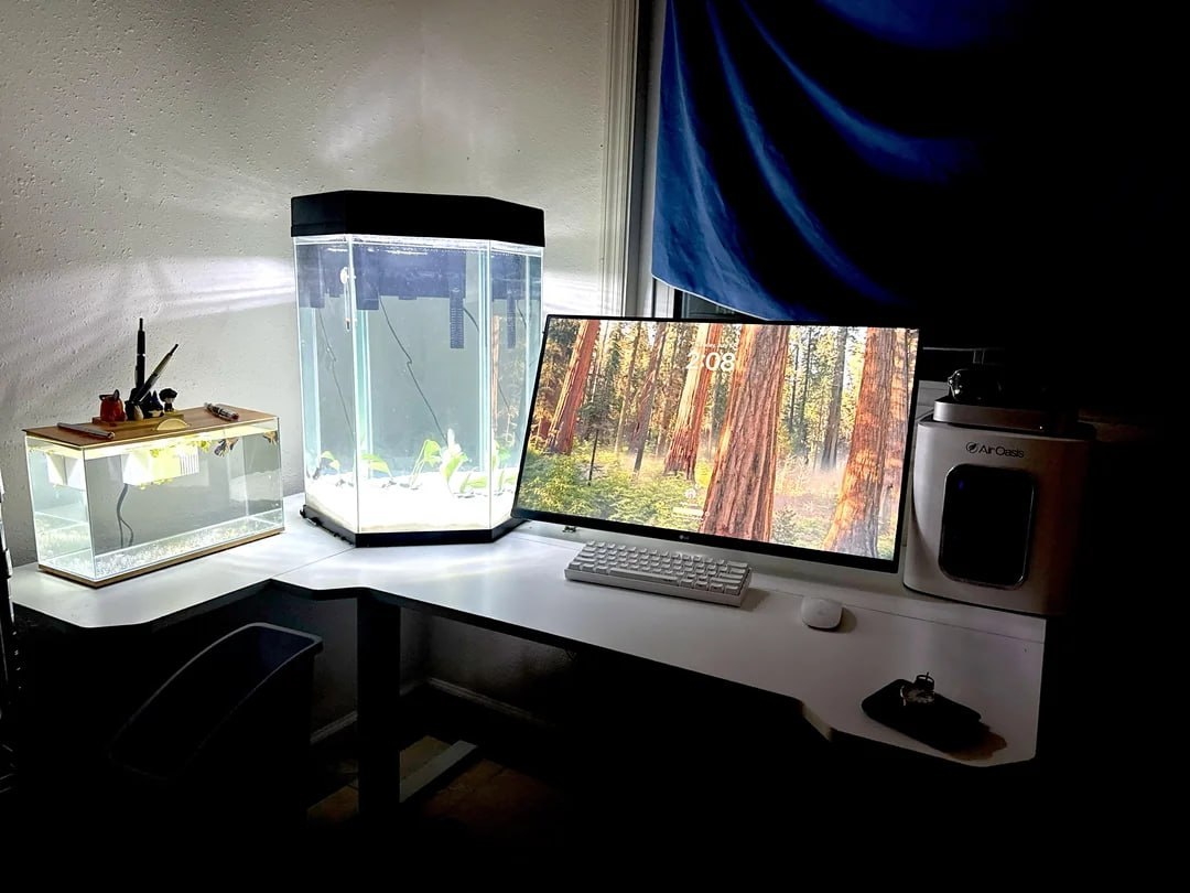 В паблике MacSetups на Reddit наткнулись на это «ночное» рабочее место и чуть было не захлебнулись от нахлынувшей ностальгии. У нас ведь был! Был почти такой же рабочий стол с таким же аквариумом!