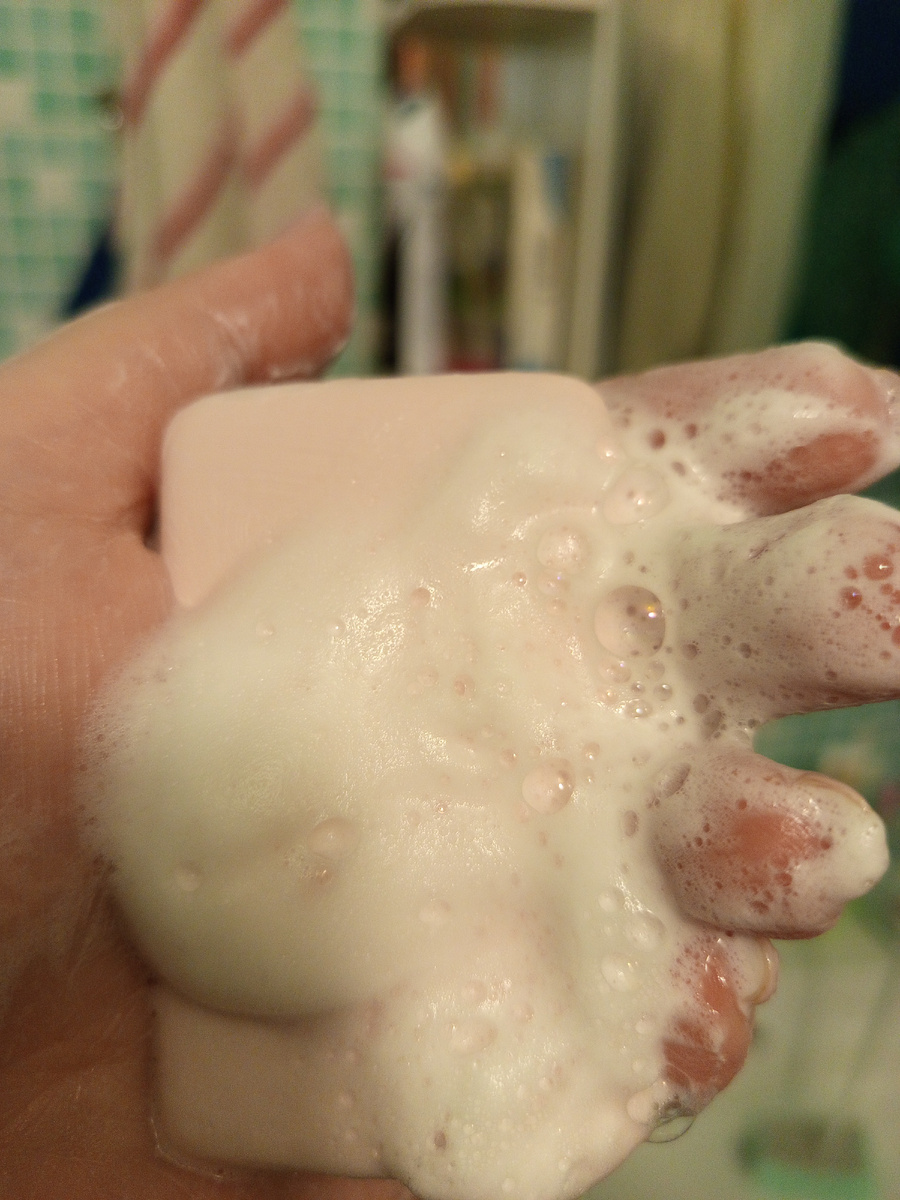Мыло нежно-розового цвета. Пенка жиденькая, лосьенистая, мелкопузырчатая. По запаху больше напоминает шиповник, когда цветёт. Кожу не сушит и аромат не оставляет потом.